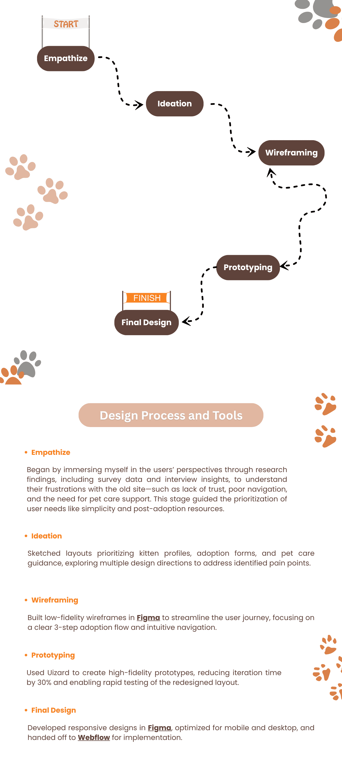 Navigation Challenges: Survey results showed 75% of users found the old site’s navigation confusing, with 60% citing buried CTAs (e.g., “Adopt Now”) as a major issue. Heatmaps confirmed low engagement with secondary pages, indicating a cluttered hierarchy.